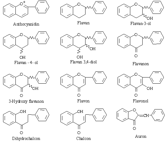1. Euflavonoid: Euflavonoid bao gồm các nhóm: anthocyanidin, flavan, flavan 3-ol, flavan 4-ol,flavan 3,4-diol, flavanon, 3-hydroxy flavanon, flavon, flavonol, dihydrochalcon, chalcon, auron.