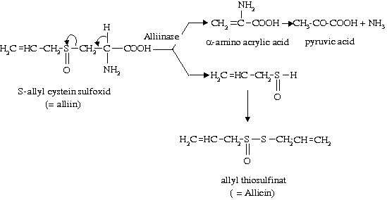 gốc alkyl R có thể là methyl, ethyl, allyl, butyl, trong đó chất chính là S- allyl cystein sulfoxid hay là alliin (R = CH2 =CH–CH2 –). Bản thân alliin không có tác dụng kháng khuẩn nhưng dưới tác dụng của enzym alliinase có sẵn trong tỏi thì giải phóng ra allicin là một alkyl thiosulfinat có tác dụng. Sự  chuyển hóa này xảy ra rất nhanh: 50% trong 2 phút. Muốn có alliin thì phải làm mất hoạt tính của enzym trước khi chiết xuất.